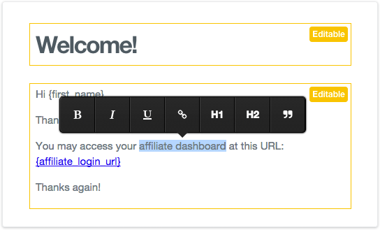 Design your affiliate program to match your brand. Upload your logo, use your own domain within referral links, and even set up special auto emails to be sent to affiliates.